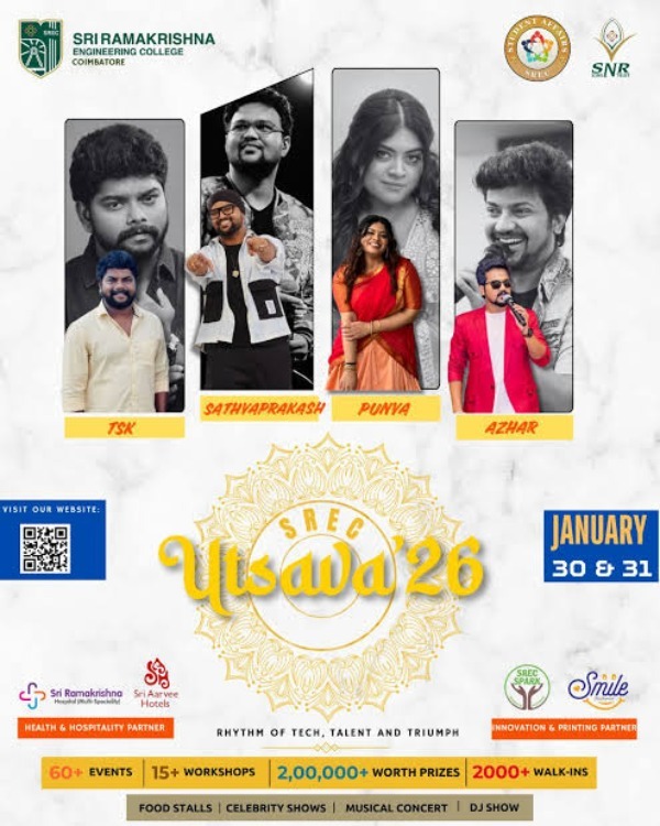SREC Utsava 26 is the grand annual cultural and technical fest of Sri Ramakrishna Engineering College , Coimbatore**, bringing together students, innovators, and artists for two days of celebration, creativity, and competition. Scheduled on January 30 & 31 , the event promises a vibrant mix of technology, talent, and entertainment. The festival features 60+ events and 15+ workshops , offering students opportunities to showcase skills across technical, cultural, and creative domains. With ₹2, 00, 000+ worth of prizes and over 2000+ expected walk-ins, Utsava 26 is set to be one of the largest campus festivals in the region. The highlight of the event includes celebrity performances by TSK, Sathya Prakash, Punya, and Azhar, along with live musical concerts and DJ shows. Participants can also enjoy food stalls, interactive sessions, and networking opportunities throughout the fest. Utsava 26 stands as a celebration of innovation, expression, and student spirit, truly reflecting the theme: Rhythm of Tech, Talent and Triumph.